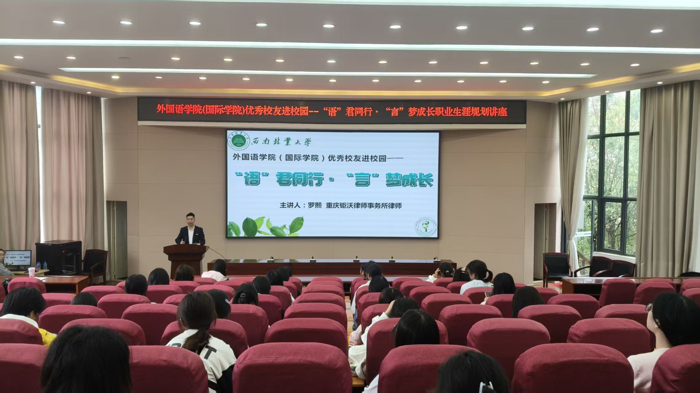 10月9日,外国语学院(国际学院)在立德楼二楼报告厅举办“‘语’君同行·‘言’梦成长”优秀校友进校园主题讲座,特邀重庆钜沃律师事务所合伙人、跨境法律服务中心主任、外国语学院(国际学院)2017届越南语专业校友罗熙律师担任主讲。60名2025级新同学参加了本次活动。