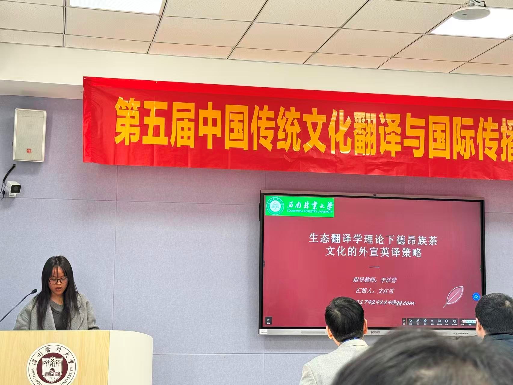 12月5-7日,第五届中国传统文化翻译与国际传播学术研讨会在温州医科大学隆重召开。我校汪学华、陈桂香、文江雪一行三人参会。本次会议主要探讨人工智能背景下中国传统文化对外翻译与国际传播的重要性。来自全国80余所高校的近300位专家学者和研究生参会交流,设有12场专家主旨报告及6个分论坛,学术氛围浓厚,思想交流活跃。