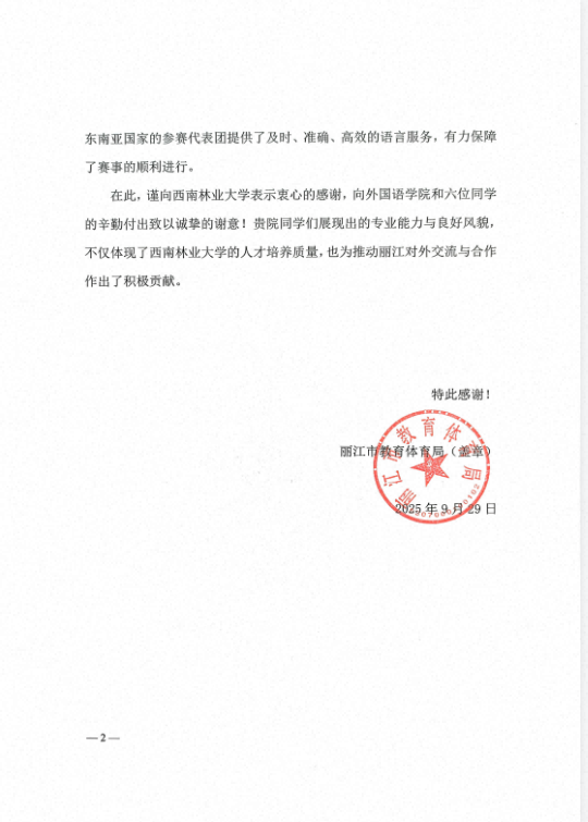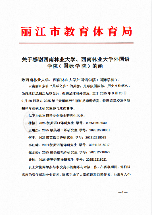 近日,丽江市教育体育局专门致函外国语学院(国际学院),对我院翻译硕士语言服务团队在2025年“天雨流芳”丽江足球邀请赛中提供的卓越语言服务表示高度认可与衷心感谢。