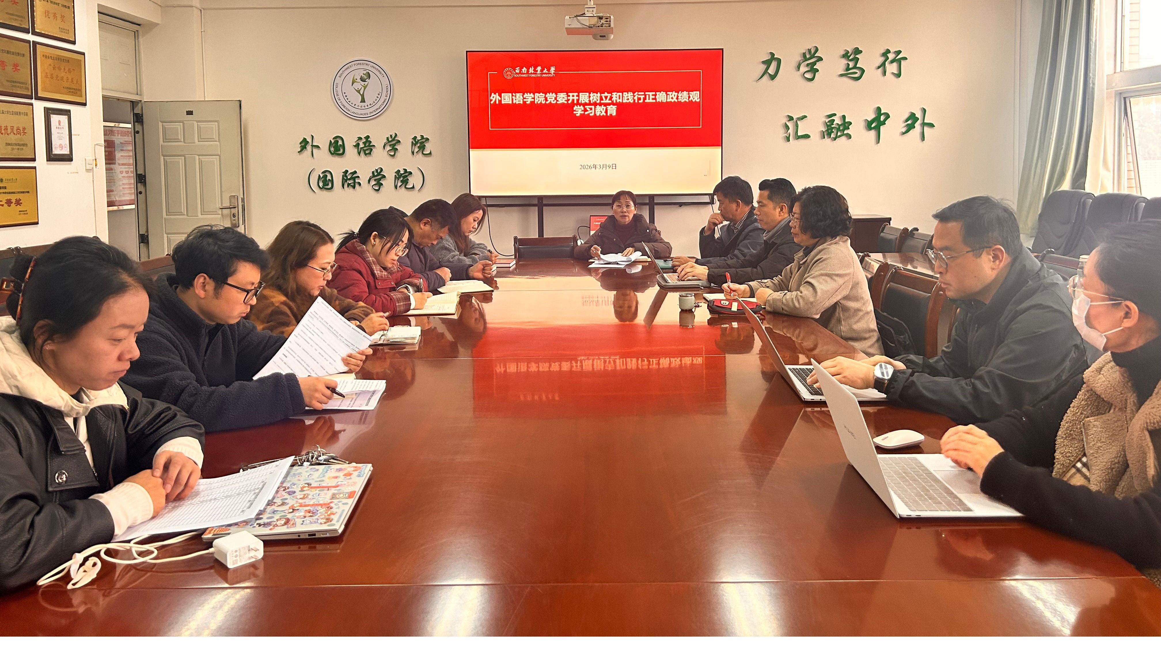 3月9日,外国语学院党委召开扩大会议,传达学习贯彻习近平总书记关于树立和践行正确政绩观学习教育的重要讲话和重要指示精神,贯彻落实党中央、省委党的建设工作领导小组会议精神、省委教育工委和学校的有关会议要求,研究安排学院开展树立和践行正确政绩观学习教育工作。外国语学院党委书记姜丽红主持会议并讲话,党委委员、党支部书记参加会议。
